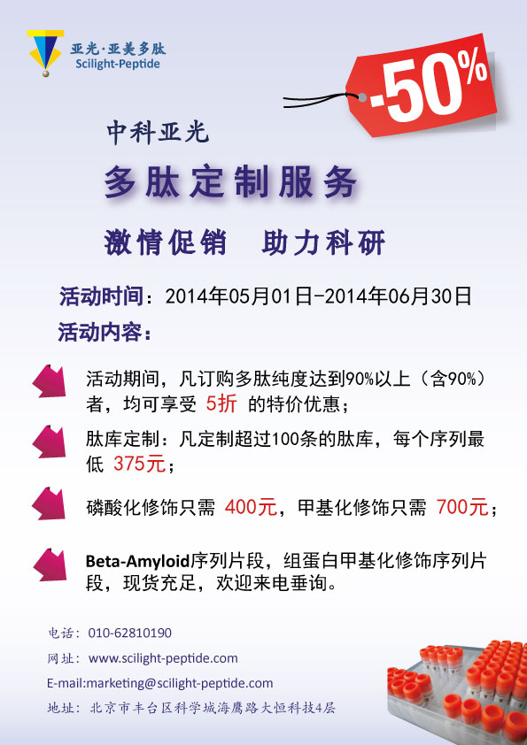北京中科亚光生物科技有限公司从2003年成立至今,以十年的丰富经验为科研用户提供质量可靠的多肽合成服务。为了回馈广大用户的热情支持,我们的促销活动正在火热进行: